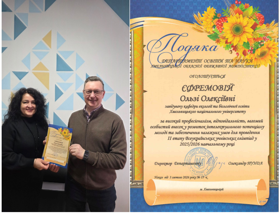 Завідувачку кафедри екології та біологічної освіти Хмельницького національного університету Ольгу Олексіївну Єфремову відзначено Подякою Департаменту освіти та науки Хмельницької обласної державної адміністрації за високий професіоналізм, відповідальність та вагомий особистий внесок у розвиток інтелектуального потенціалу учнівської молоді.