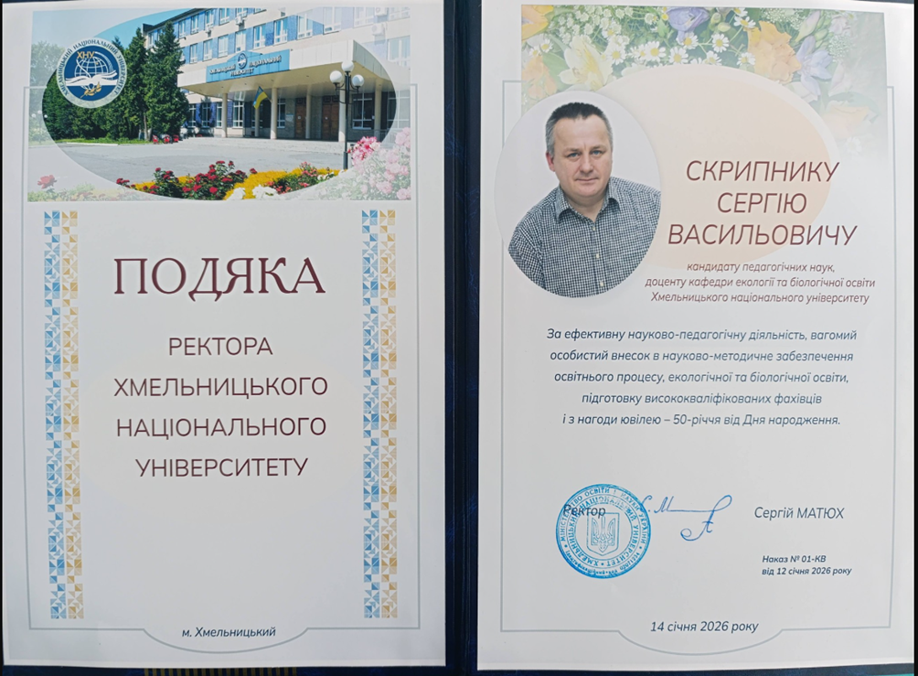 Щиро вітаємо Сергія СКРИПНИКА із отриманням ПОДЯКИ РЕКТОРА ХНУ за ефективну науково-педагогічну діяльність, вагомий особистий внесок у науково-методичне забезпечення освітнього процесу, екологічної та біологічної освіти, підготовку висококваліфікованих фахівців і з нагоди ювілею – 50-річчя від Дня народження.