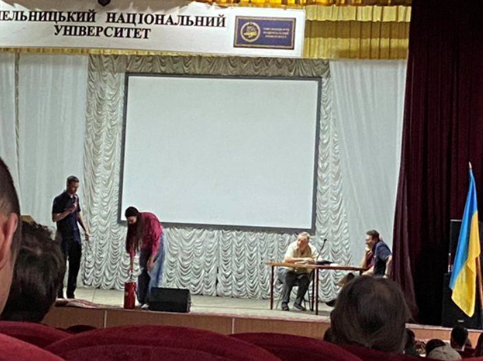 Євген ПОТАПЧУК –доктор психологічних наук, професор, Заслужений працівник освіти України, професор кафедри психології та педагогіки Хмельницького національного університету, пояснив студентам, як діяти у стресових ситуаціях, як допомогти собі та іншим подолати паніку, знизити рівень тривожності та підтримати емоційну рівновагу. Розглядалися техніки дихання, короткі вправи на самозаспокоєння, а також основні принципи спілкування з людьми, які пережили сильний стрес або шок.