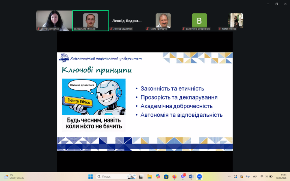 Під час вебінару обговорювалися питання відповідального використання технологій, баланс між інноваціями та дотриманням академічних стандартів, а також можливі ризики та переваги впровадження штучного інтелекту в освіті. Зустріч супроводжувалася активною дискусією та обміном досвідом між учасниками.