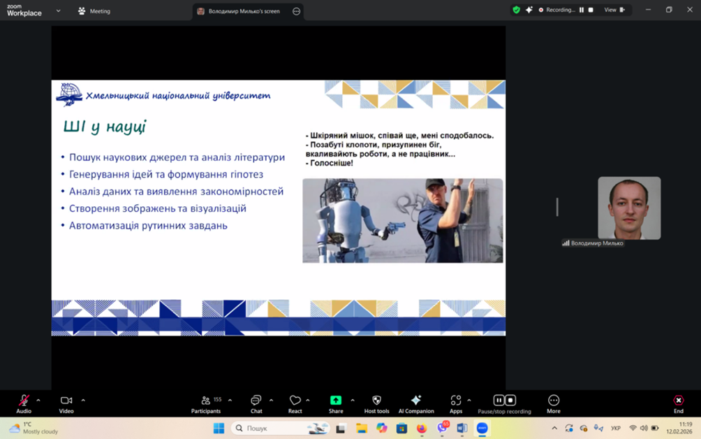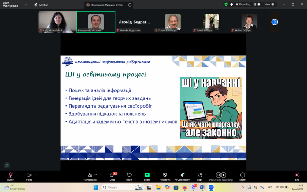 12 лютого 2026 року викладачі кафедри екології та біологічної освіти взяли участь у вебінарі «Політика використання штучного інтелекту у ХНУ», організованому відділом післядипломної освіти університету.