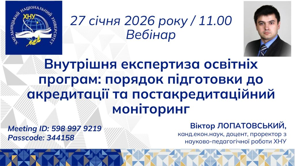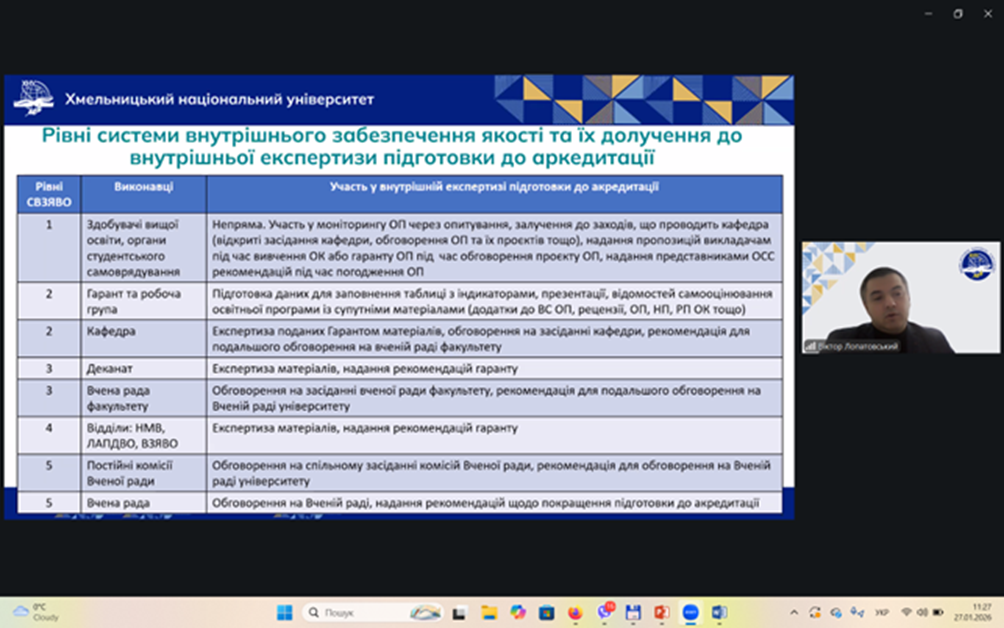 27 січня 2026 року у Хмельницькому національному університеті відбувся вебінар для науково-педагогічних працівників на тему «Внутрішня експертиза освітніх програм: порядок підготовки до акредитації та постакредитаційний моніторинг», в якому взяли участь викладачі кафедри екології та біологічної освіти.