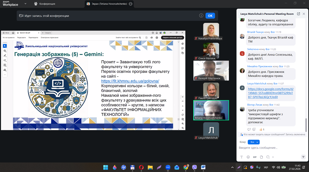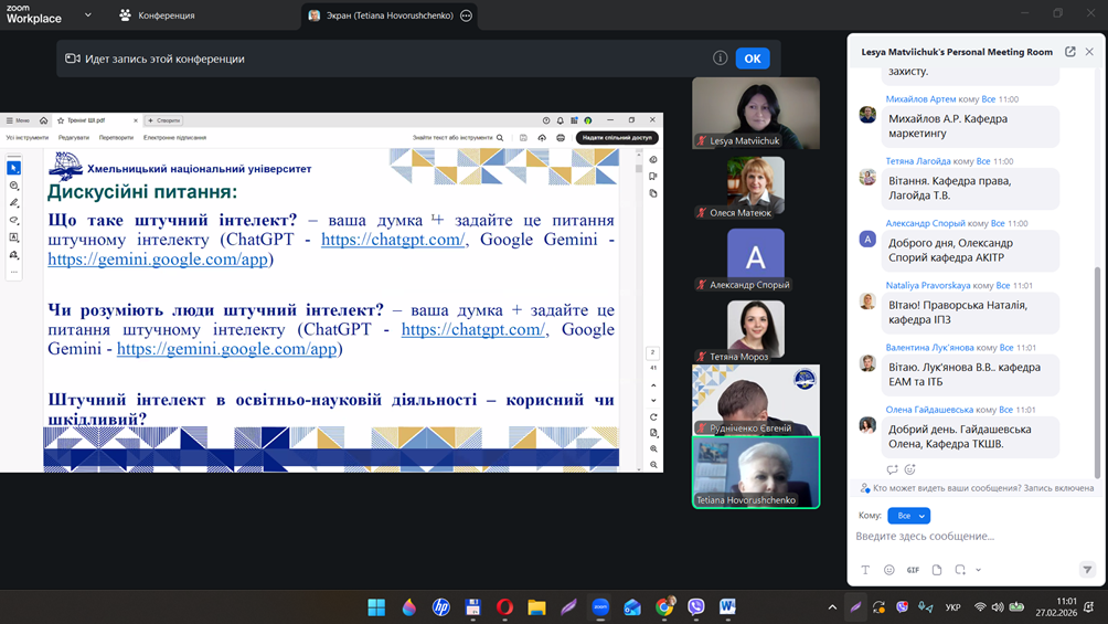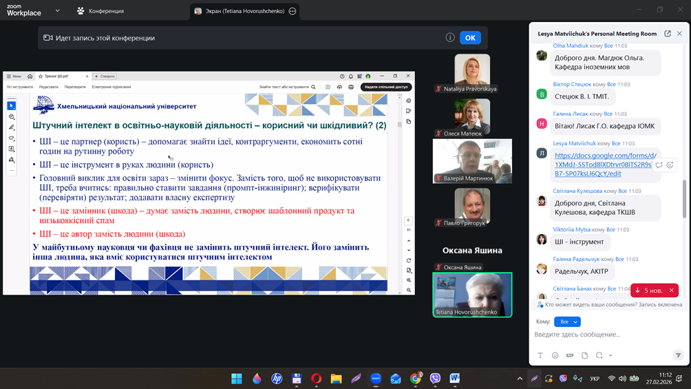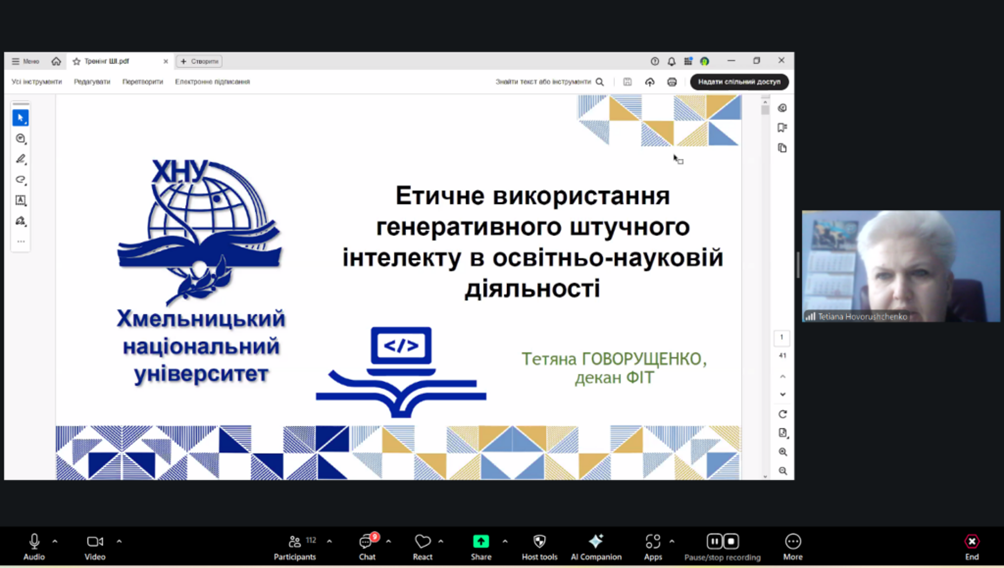 27 лютого 2026 року Центром післядипломної освіти Хмельницького національного університету було проведено вебінар на тему «Етичне використання генеративного штучного інтелекту в освітньо-науковій діяльності». Спікером заходу виступила доктор технічних наук, професор, декан факультету інформаційних технологій Тетяна ГОВОРУЩЕНКО.