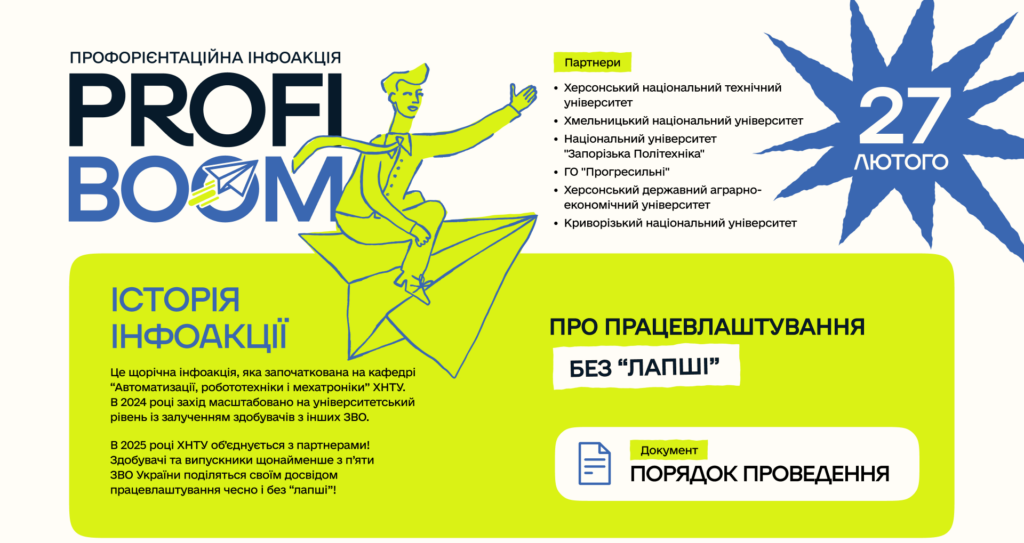 PROFIBOOM – це щорічна інфоакція, яка започаткована у Херсонському національному технічному університеті. 2024 року захід масштабовано на університетський рівень із залученням здобувачів освіти з інших ЗВО. Головна мета заходу – це студенти діляться зі студентами реальними історіями з професійного досвіду, дають корисні поради тим, хто в пошуках роботи. Тут можна дізнатися, як правильно написати і подати резюме, як адаптуватися у новому колективі, що краще: фріланс чи офіс, чи варто створювати особистий бренд для пошуку роботи і багато цікавого «без лапші».
