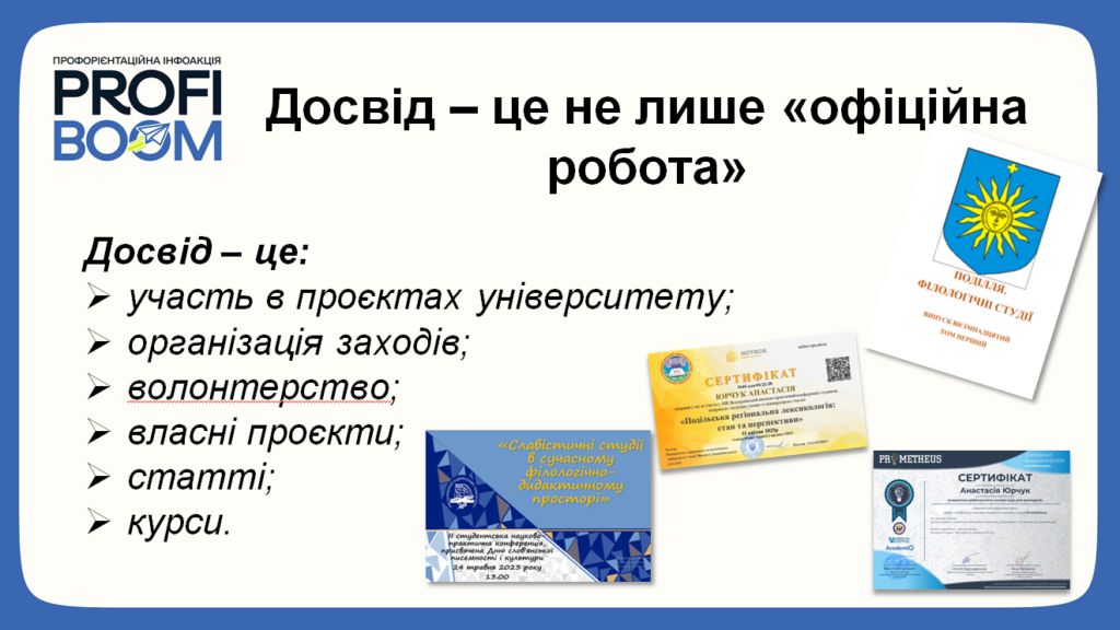 27 лютого 2026 року студентка 4 курсу, групи ФУМ-22, майбутній український філолог Анастасія Юрчук взяла участь в інформаційній кампанії PROFIBOOM та поділилася враженнями від заходу. Студентка розповіла, що протягом двох років працює репетитором і вчителем в онлайн-школі, поєднує роботу і навчання.