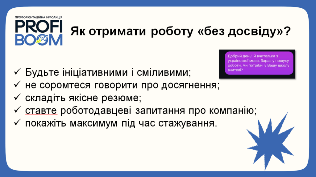 Додатково зазначимо, що минулого року, 28 лютого 2025 року випускники гуманітарно-педагогічного факультету Хмельницького національного університету: Тетяна Храпак, Андрій Омельченко, Тетяна Філіпова (випускники кафедри слов’янської філології та кафедри соціальної роботи і соціальної педагогіки)взяли участь у профорієнтаційній інфоакції «Профібум: про досвід працевлаштування «без лапші»» – відкритого заходу, спрямованого на обмін досвідом щодо працевлаштування, формування культури взаємодопомоги та взаємопідтримки серед молодих фахівців. Вони люб’язно поділилися своїм професійним досвідом і здобутими успіхами.