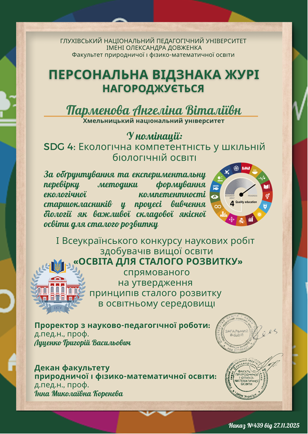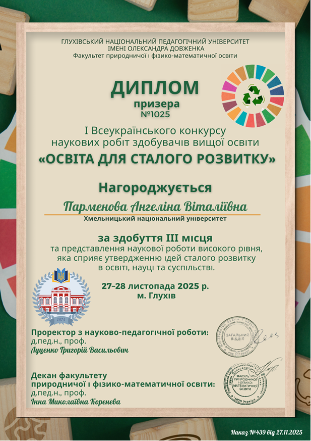 Здобувача другого (магістерського) рівня вищої освіти за ОП Середня освіта (Біологія та здоров’я людини) Ангеліна ПАРМЕНОВА, взяла участь у Всеукраїнському конкурсі наукових робіт «Освіта для сталого розвитку», який відбувся 27-28 листопада 2025 року на базі Глухівського національного педагогічного університету імені Олександра Довженка.